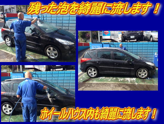 水でホコリを落としきめ細かい泡、柔らかいでスポンジでお車のすみずみまで手洗いにて行います。